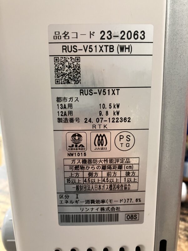 商品名:瞬間湯沸かし器 RUS-V51XTB 2024年製