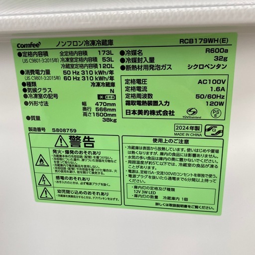 【 2024年製 Comfee 173L冷蔵庫 RCB179WH】お買取りいたしました!