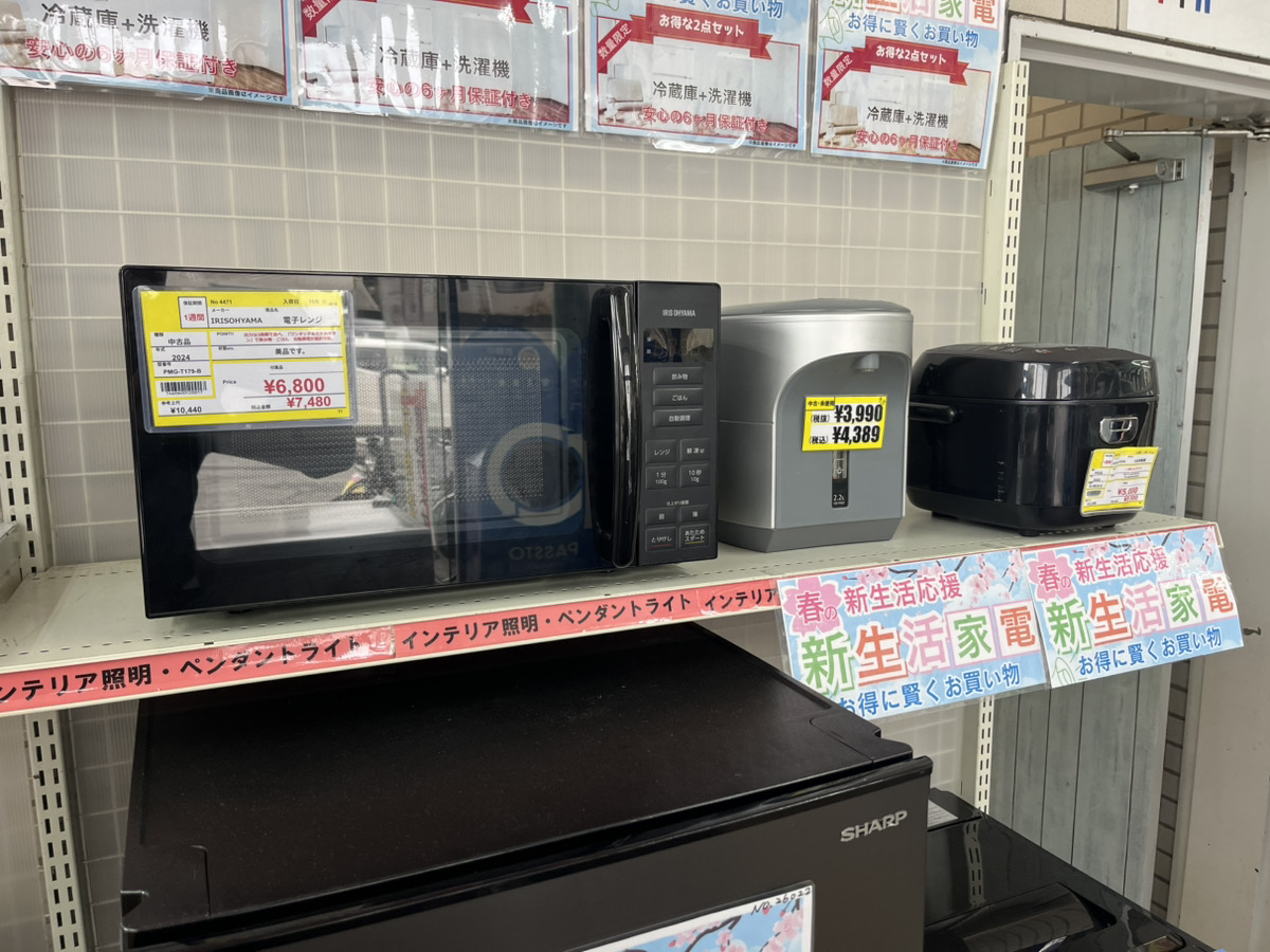 冷蔵庫、洗濯機、電子レンジ、電気ケトル・ポット、炊飯器、テレビ、ソファ、タンス、食器棚、自転車など新生活に必要な分はほとんど揃ってしまいます。