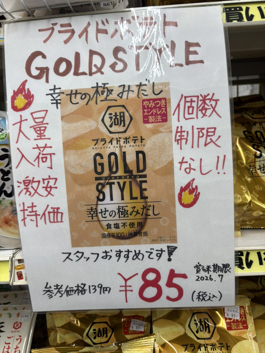 人気の「プライドポテト GOLD STYLE」が、なんと1個¥85で大量入荷しました!